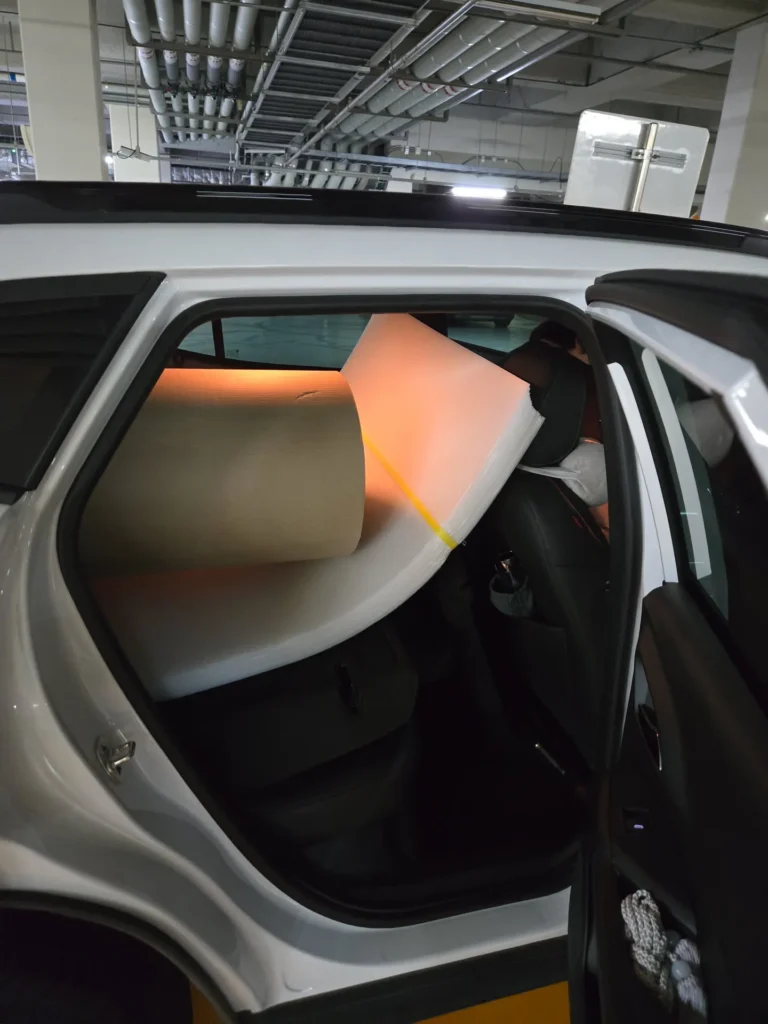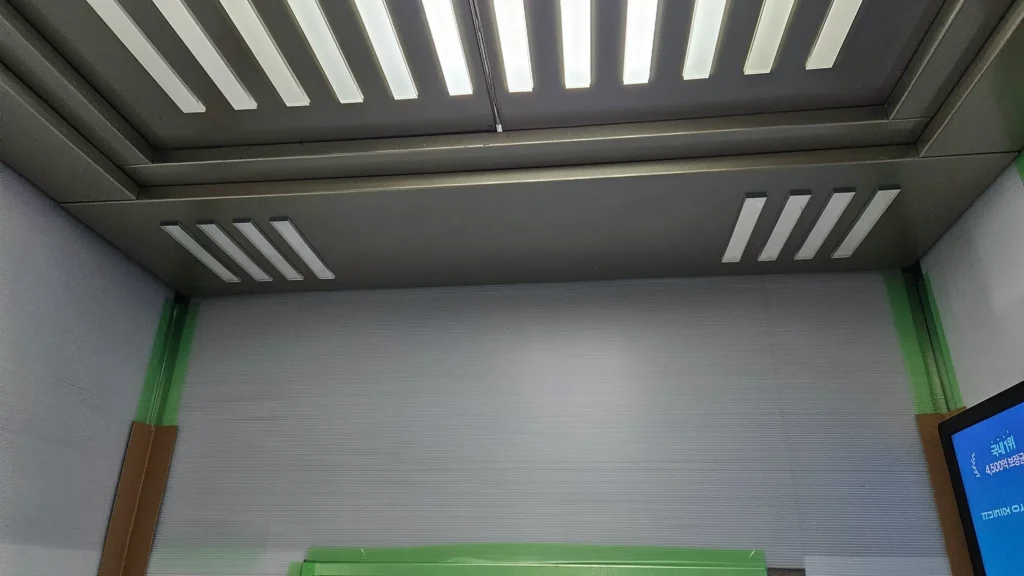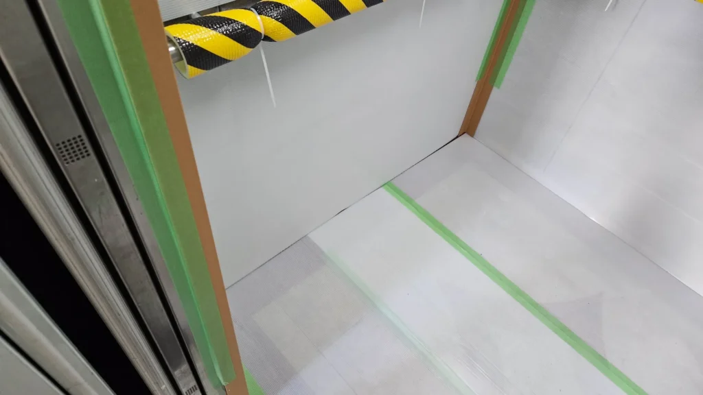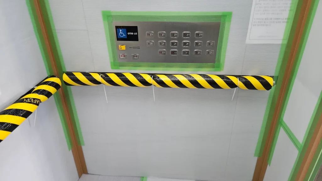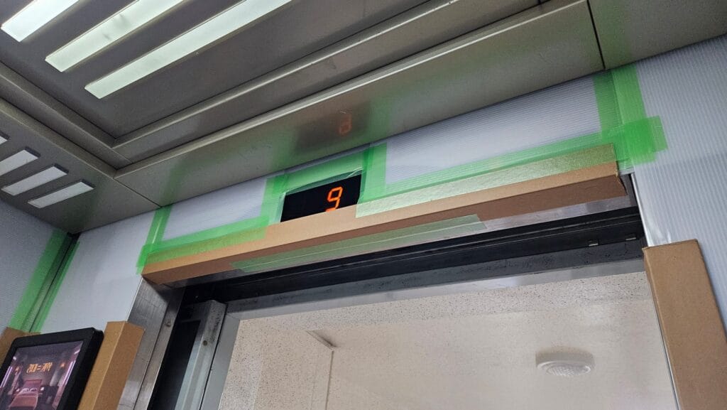 근데, 진짜, 누가봐도 힘 빡 줘서 보양했는데… 이걸 오래 붙여놓으니(신고한 공사기간 전에 먼저 작업함) 8일 내내 인테리어 하는거냐고, 그런거면 엘베사용료를 더 내라는 이상한 소리를 해서 중간에 떼어놓았다가 나중에 직접 다시 붙였다. 한여름에 정말 더웠다 ㅜ.