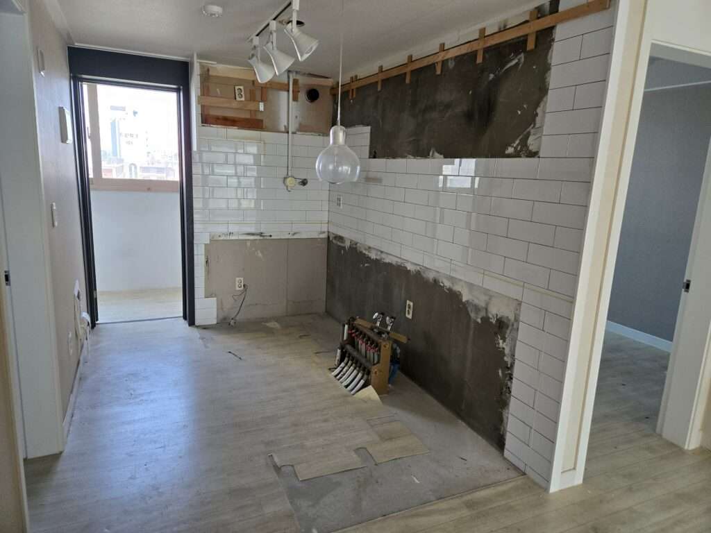 그래서 최종적으로 작업 진행순서는 싱크대 철거 → 주방 타일 교체 → 마루 시공 → 도배 → 싱크대 설치가 되었다.