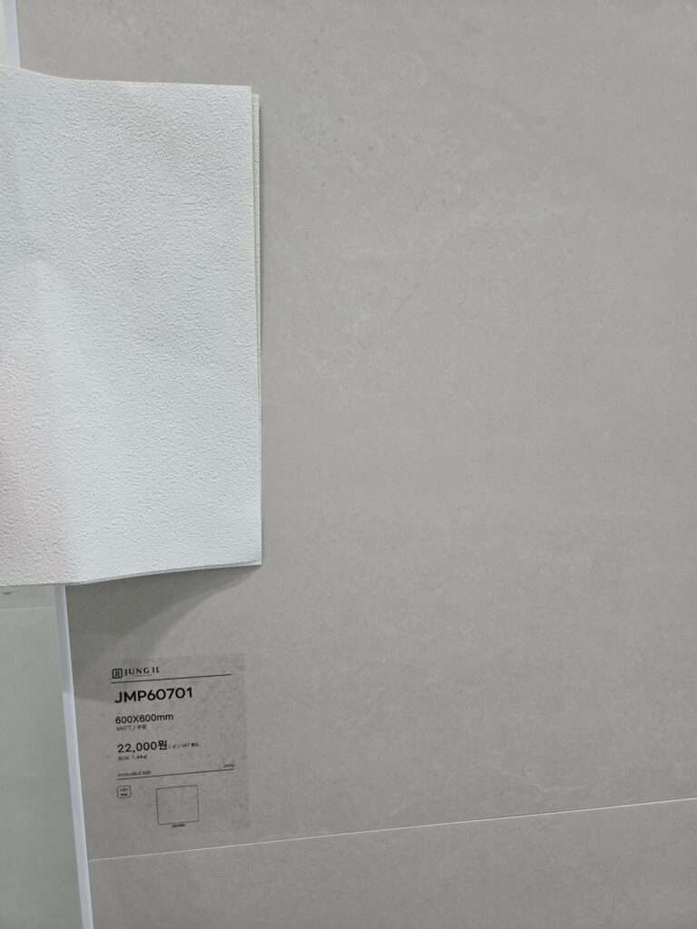 아래는 우리가 사용할 벽지를 이용해 내가 마음에 들어했던 가격이 좀 나갔던 이태리제 타일과, 우리가 골랐던 타일(JMP60701)을 비교하면서 찍어놓았던 사진이다. 확실히 무늬의 차이가 있다(물론 이것이 타일의 ‘품질’의 차이가 난다는 것은 아니다).