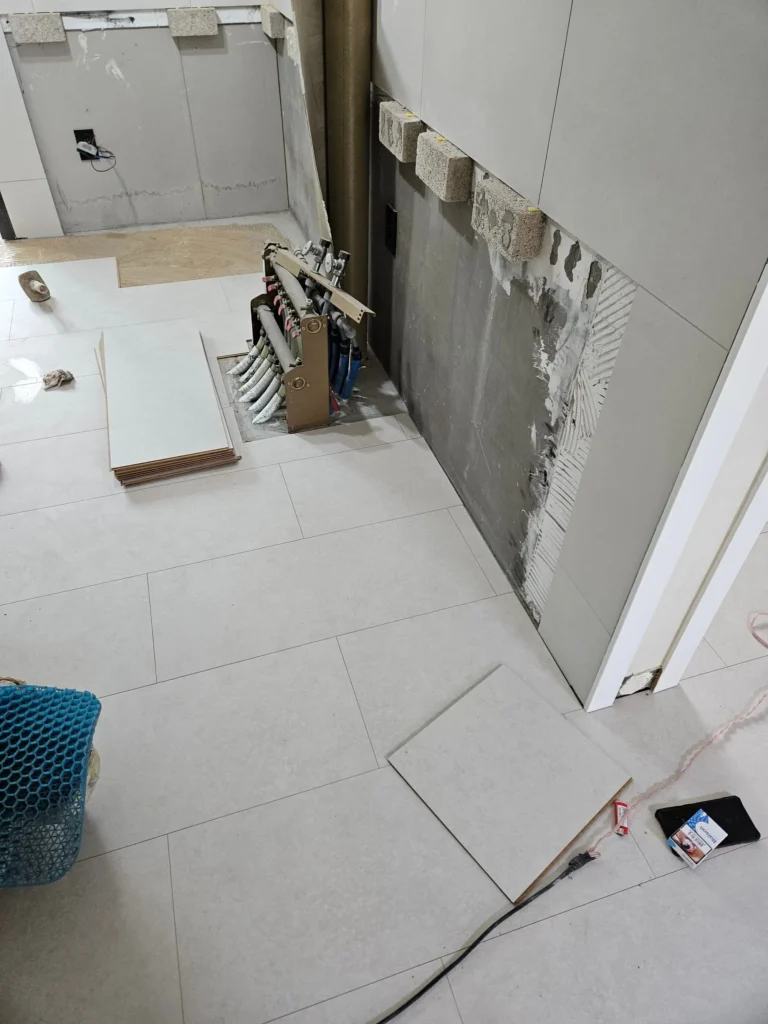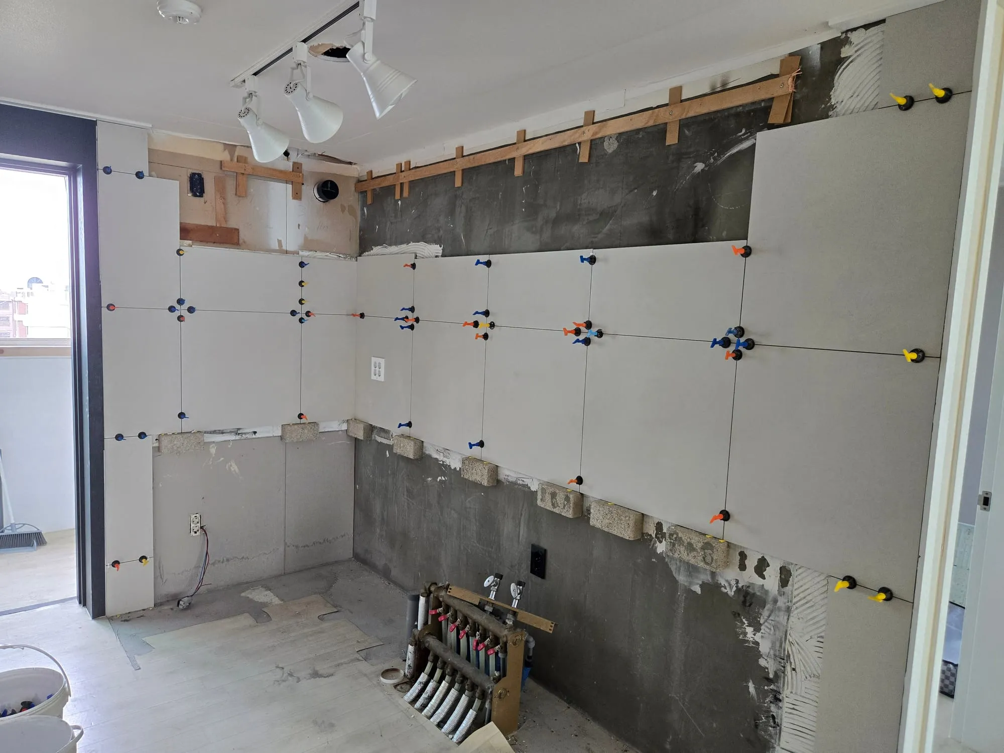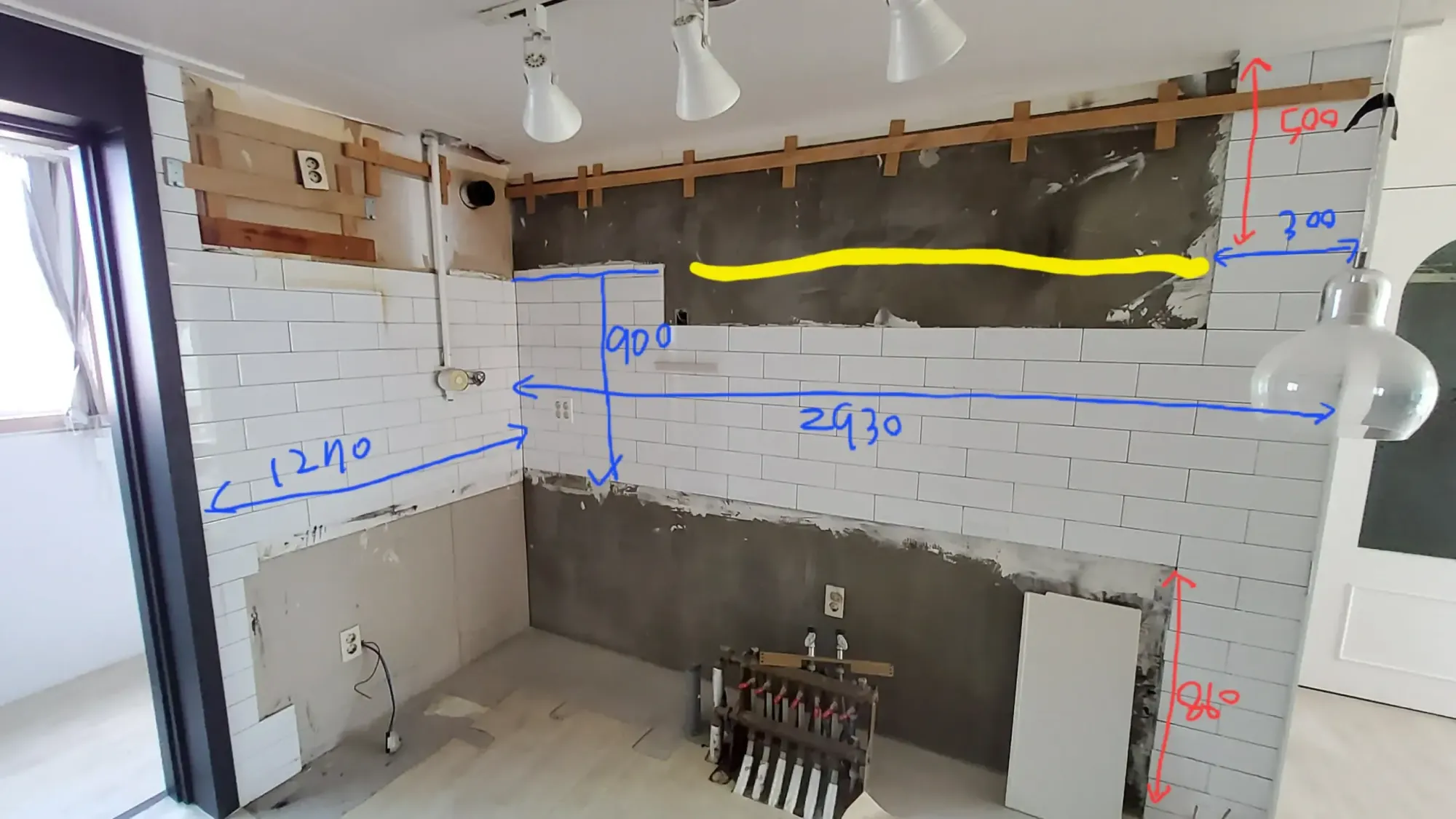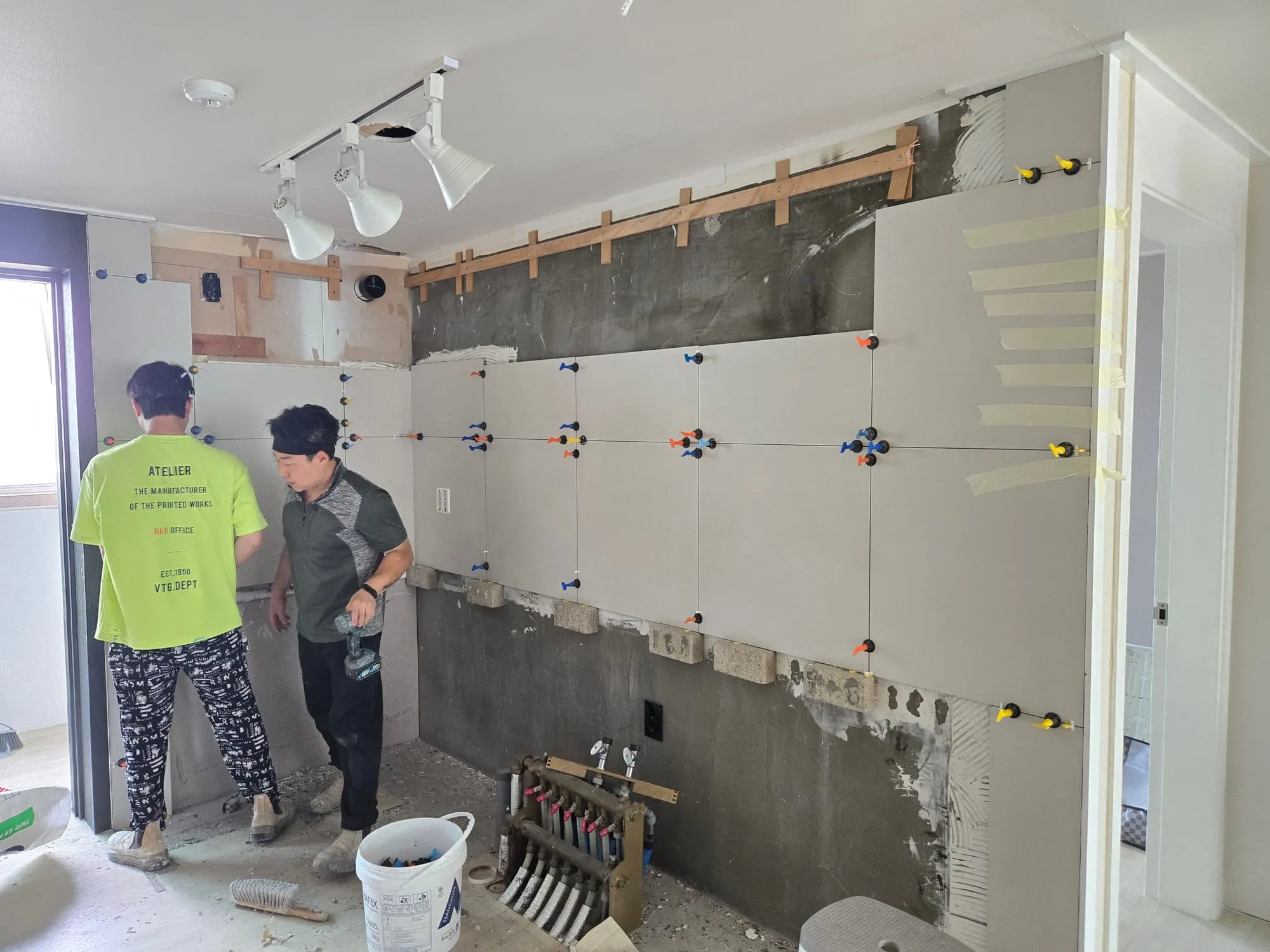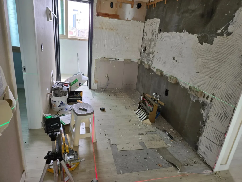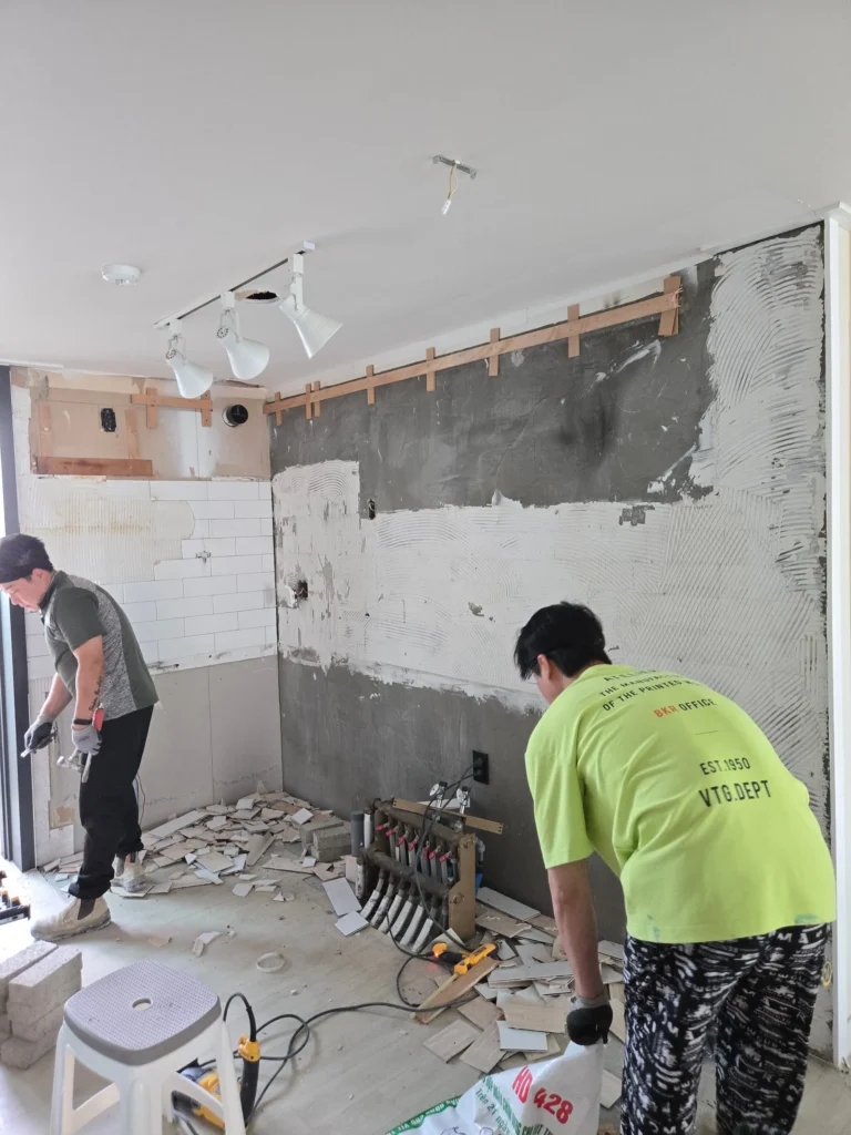 다용도실과 맞닿은 벽의 타일은 철거하지 못했다. 타일 제거 시 석고가 같이 떨어져 나갈 수 있기 때문이었다. 결국 철거비용까지 지출하고도 다용도실쪽 벽은 덧방을 선택할 수 밖에 없었다(오늘 석고가 떨어져 나가면 또 목수를 부르고 또 인건비 나가고 시공도 못하고 등등).