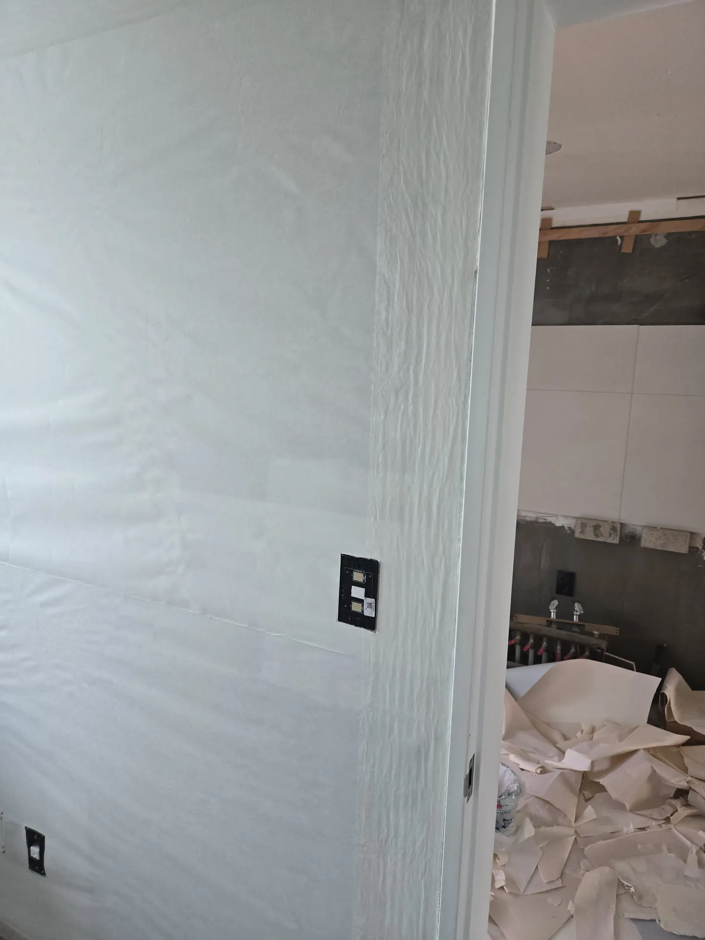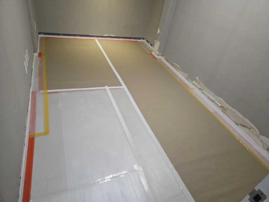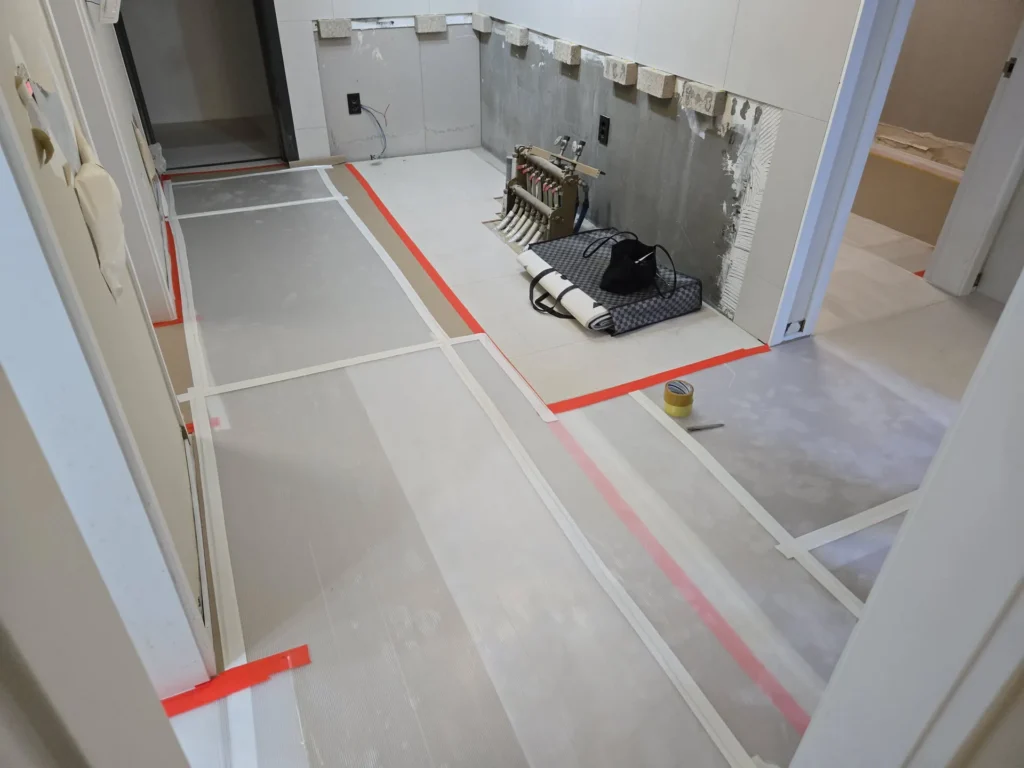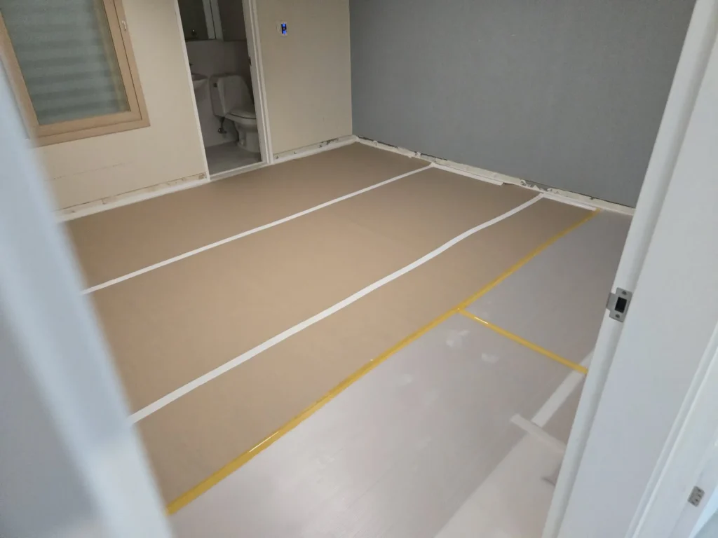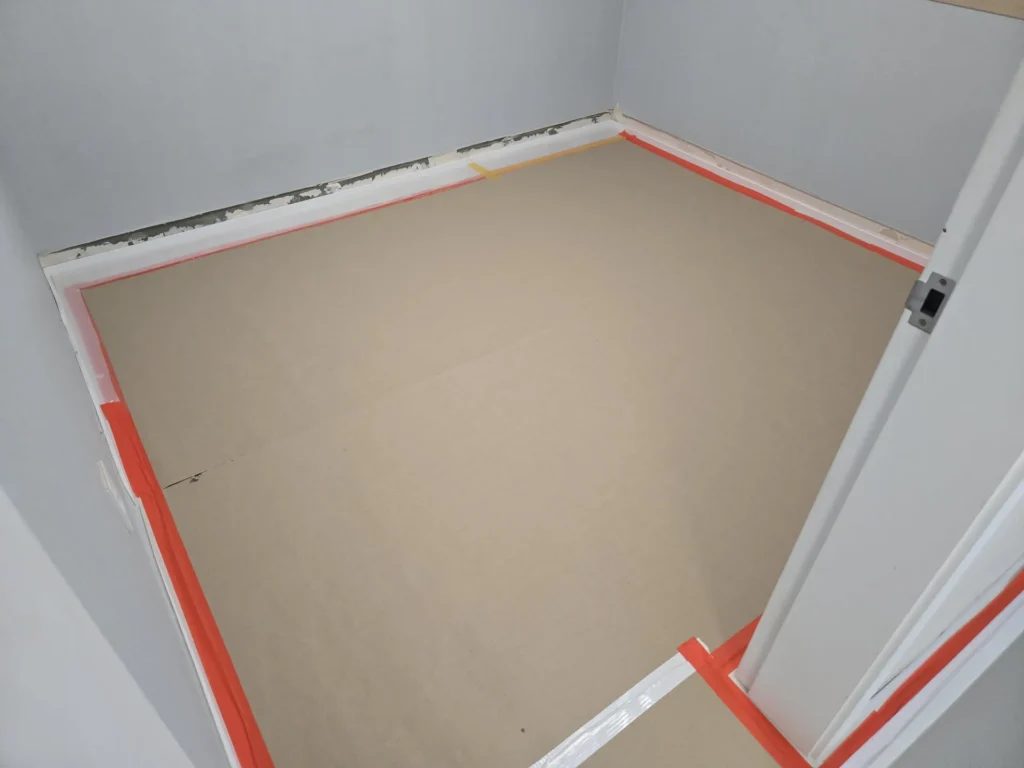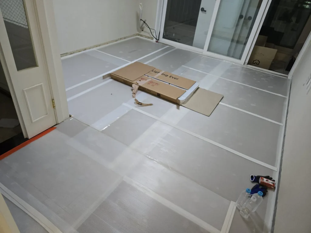 마루와 걸레받이가 잘 시공된 것을 확인했으니 마루 보호를 위해 보양작업을 할 차례였다. 도배가 들어온 후에 하는 쪽으로도 고민했는데, 도배작업자들이 사용하는 의자(?)에 마루가 찍혔다는 사례를 몇 번 봐서 먼저 하기로 했다(실제로 우리도 문틀에 찍힘 자국이 생김).