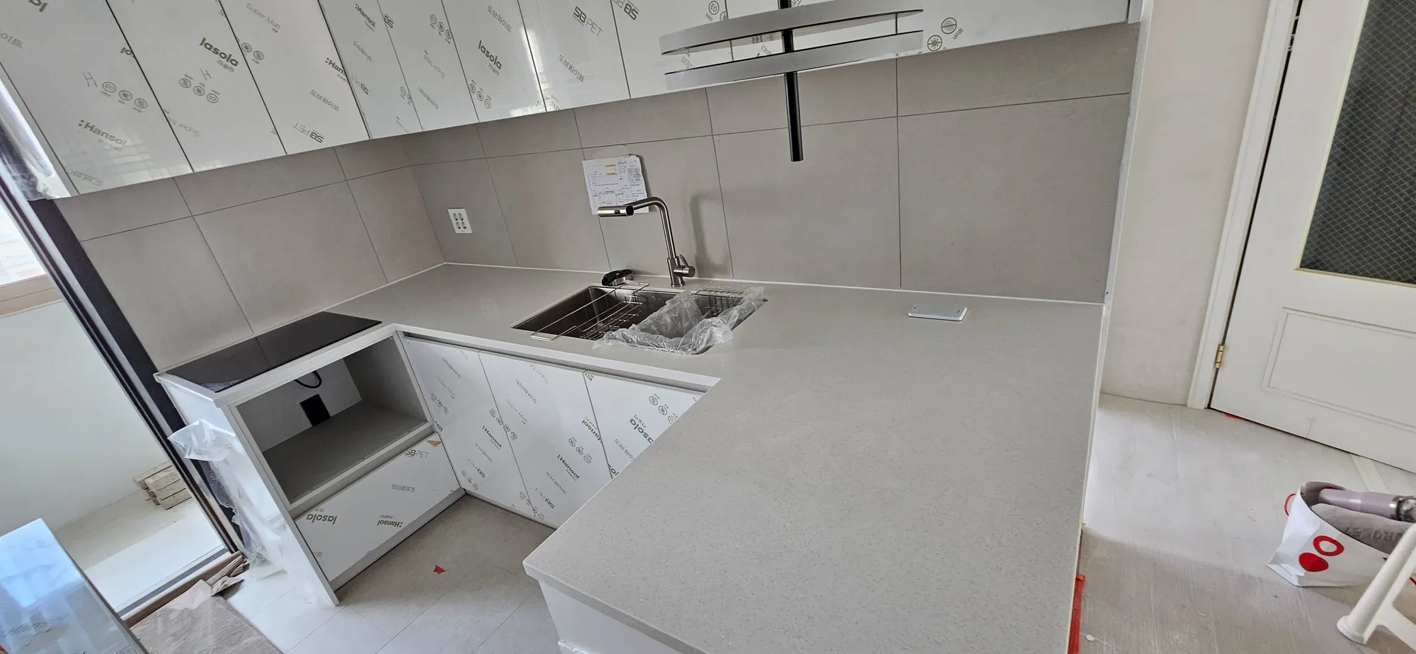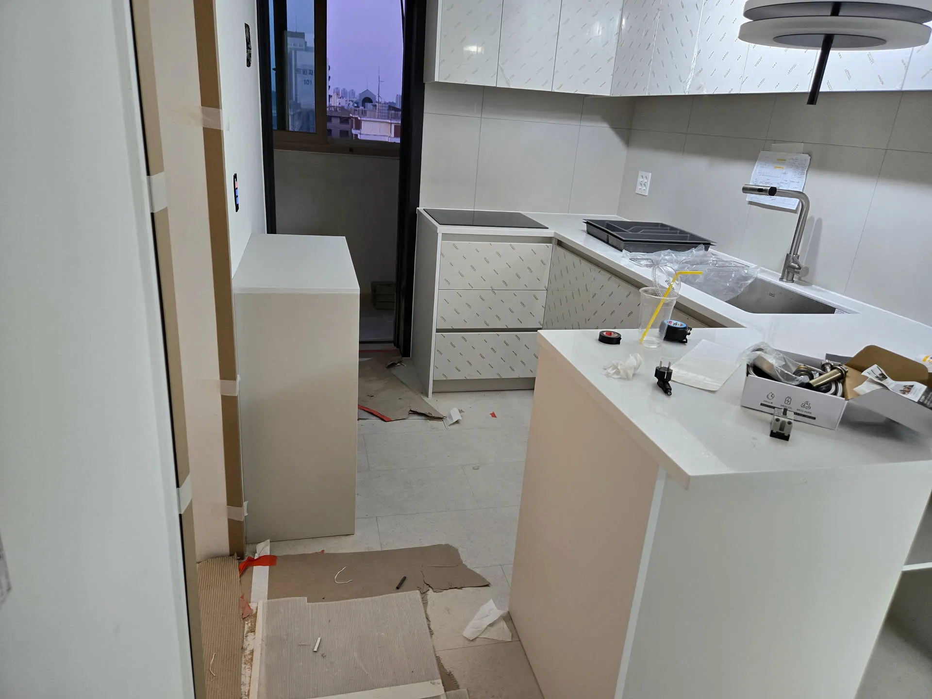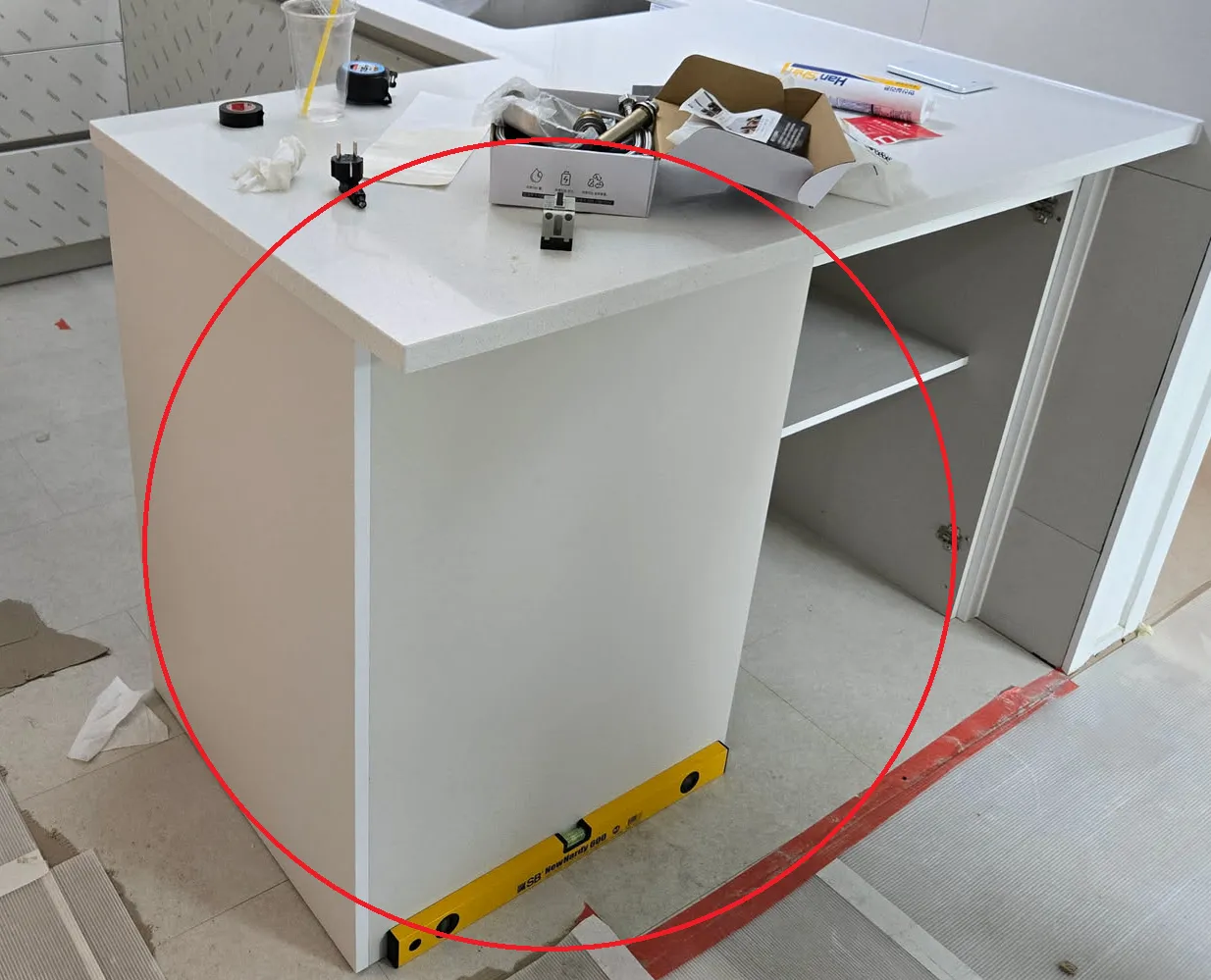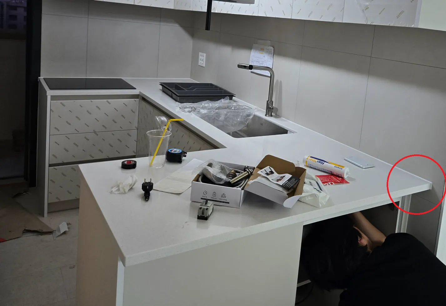 위 사진 속, 상판 위에 박스는 내가 설치해달라고 한 텀블러 세척기였다. 대리석을 설치할 때 하지 않으면 번거로워질 것을 우려해 범씽크 사장님에게 신신당부하고 또 당부하고 잘 보이게 주방바닥에 꺼내놓기까지 한 것이였음에도 불구하고, 잠깐 점심 먹으러 자리를 비운 사이에 대리석 사장이 대리석을 초스피드로 설치하기 위해 깔끔하게 개무시하고 지 할일만 한거다.