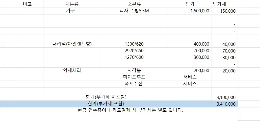 어차피, 외장재 불량과 인덕션 밑 하부장 사양 불일치 때문에 범씽크 사장님과 그 날 저녁에 다시 만났고, 외장재 문제와 별도로 대리석에 대해서는 대리석 사장을 다시 데려와서 모자란 부분을 ‘연장’해주겠다고 했다. 돈 300을 주고 ‘연장’처리를 해주겠다는 부분이 정말 심하게 마음에 들지 않았지만, 이거 다시 자르고 떼내고 하는 것도 번거로워 보여서 알겠다고 했다.