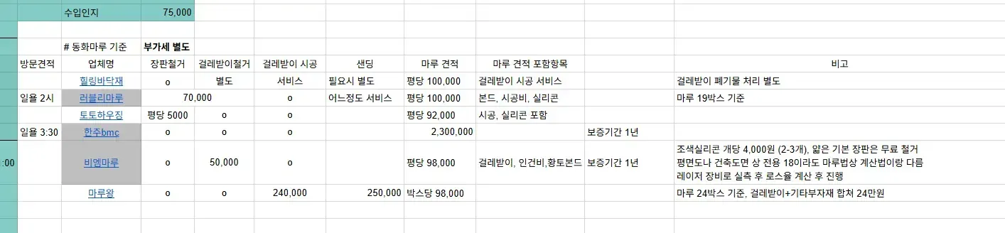 바닥 샌딩도 필수적으로 들어가야 했기 때문에, 정말 다각도로 견적을 검토했던 것 같다. 그렇게 고민한 끝에 결정한 업체는 러블리마루였다(이 선택은 지금도 후회하지 않음, 친절하심).
