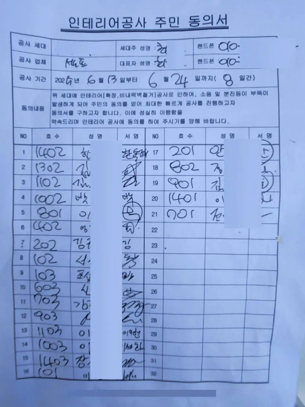 싱크대 교체는 소음 날일이 많지 않지만, 마루시공은 확실하게 소음이 예상되는 작업이었기 때문에, 관리사무소에 정식으로 신고하고 주민동의 절차를 진행했다.