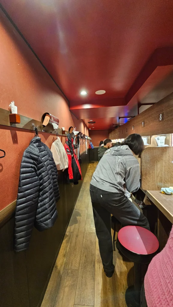 각 방 내부는 아래 사진처럼 긴 구조의 방에 개별좌석으로 되어 있었다. 독서실마냥 옆 칸을 모두 막아놨기에 주위 신경안쓰고 편안하게 식사하도록 되어 있었으며, 메뉴 서빙은 전면의 발을 걷고 직원이 가져다 준다.