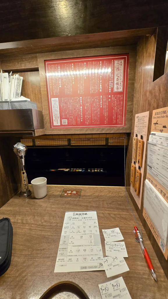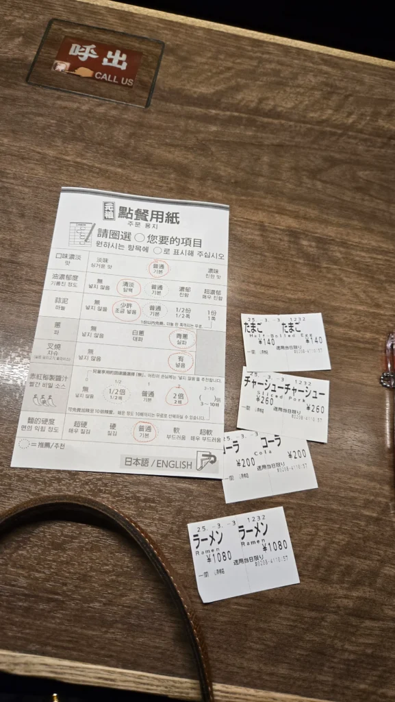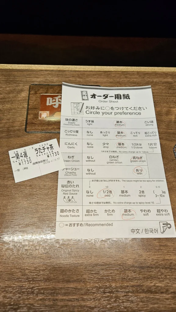 좌석에 앉으면 각 자리에 주문표가 한 장씩 놓여있다. 간, 맵기, 마늘, 파 등을 선택할 수 있고 가게 추천은 점선으로 표시되어 있다. 원하는대로 체크해서 포스기에서 나온 식권(?)과 같이 점원에게 주면 된다.