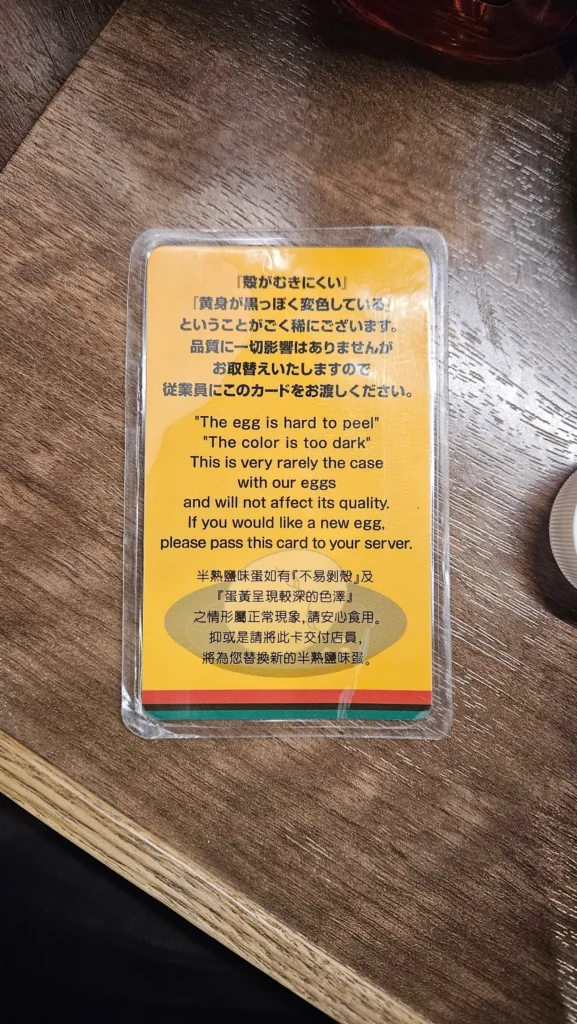 오른쪽 벽에는 추가 주문 용지와 함께 간단한 의사소통을 할 수 있는 메세지 카드가 있었는데, 단순히 외국인을 위한 게 아니라 현지인도 사용할 수 있는 카드였다. 4개 중 제일 오른쪽 하단의 카드 내용은 ‘주변 사람이 너무 소란스럽다’라는 내용이었던 것을 보아하니, 티 내지 않고 점원에게 컴플레인을 할 수 있겠다 싶었다.