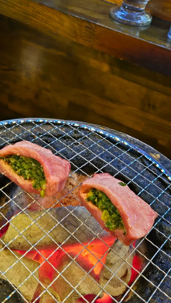 파우설을 화로 위에 올려놓고 앞 뒤를 살살 익혀가다보면, 고기가 익어가며 안에 파가 살살 밀려나왔다. 메뉴얼에 의하면 너무 많이 익히지 말고 양 면을 구우며 육즙이 흘러나오면 다 구워진 거라고 한다!