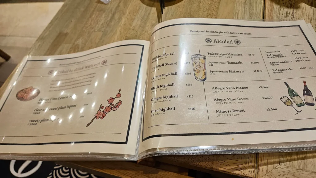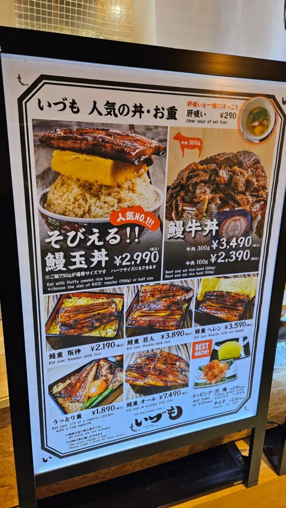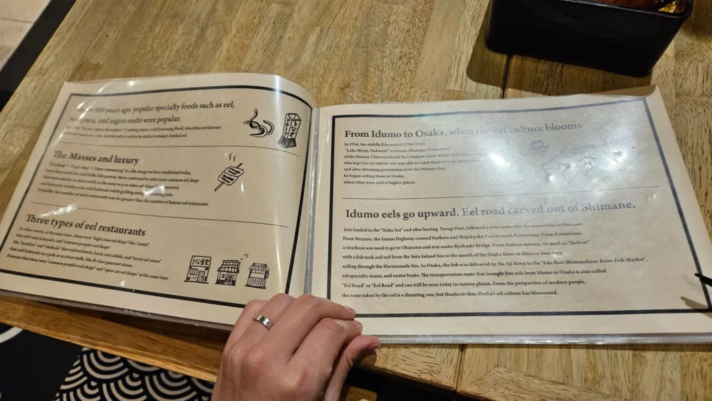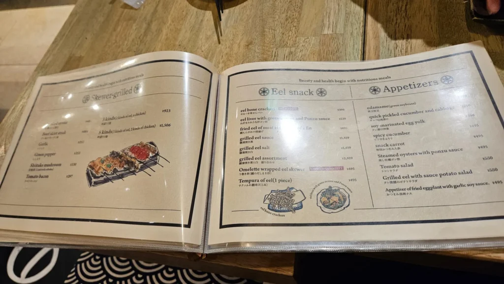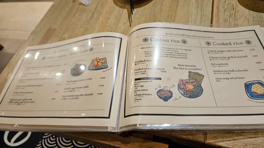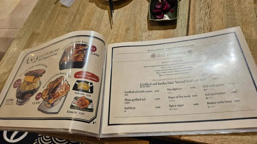 직원분들이 굉장히 친절했고 일본어에 서툰 고객을 배려하는 느낌을 많이 받았지만 처음부터 장어덮밥을 먹으려고 온 곳이기 메뉴판은 뒤적이는 시늉만 했고, 바로 장어덮밥을 주문했다. 심지어 10주년 기념 메뉴로 소고기도 같이 나오는 메뉴(3,010엔)가 있어 나는 이걸 주문했다(장어덮밥은 2,990엔).