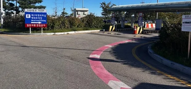 여기까지 온 후 아래처럼 유도선을 따라 통과하면 된다. 우리는 진에어 비행편을 이용할 예정이었고, 이 비행편은 제2여객터미널에서 출발했기 때문에, T2 예약주차장으로 가야 했다. 여기서 많이 헷갈렸는데, 예약 시 보증금을 꼭 돌려받기 위해서라도 예약주차장으로 들어가야 한다. 입구 잘못 찾아서 장기주차장으로 들어가버리면 예약주차장 노쇼로 보증금 날아간다.