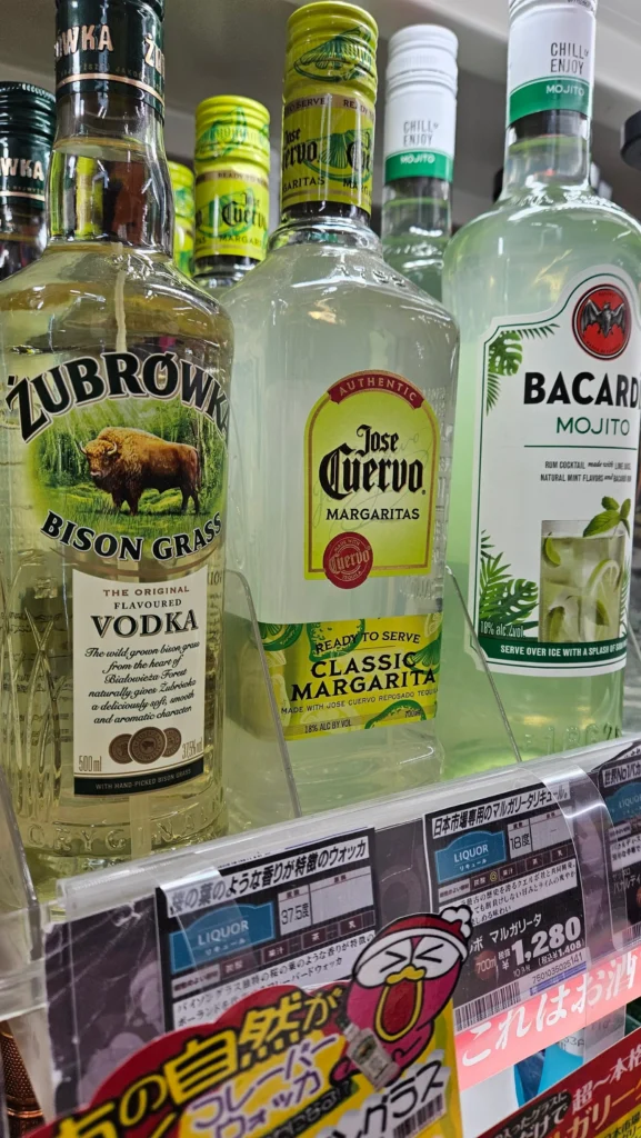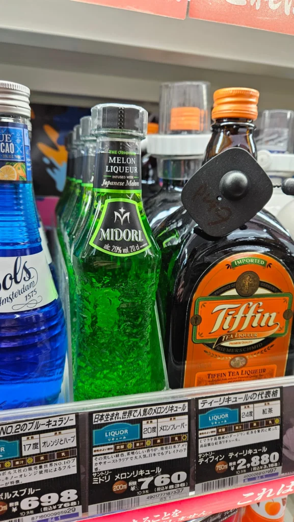 1층 한쪽으로는 주류를 상당히 많이 판매하고 있었다. 도톤보리점도 주류는 판매하고 있었지만 주로 캔으로 된 하이볼같은 소량의 제품들 위주로 판매하고 있었던 것에 비해 이 곳은 미도리나 모히또 등을 보틀로 판매하고 있었다.