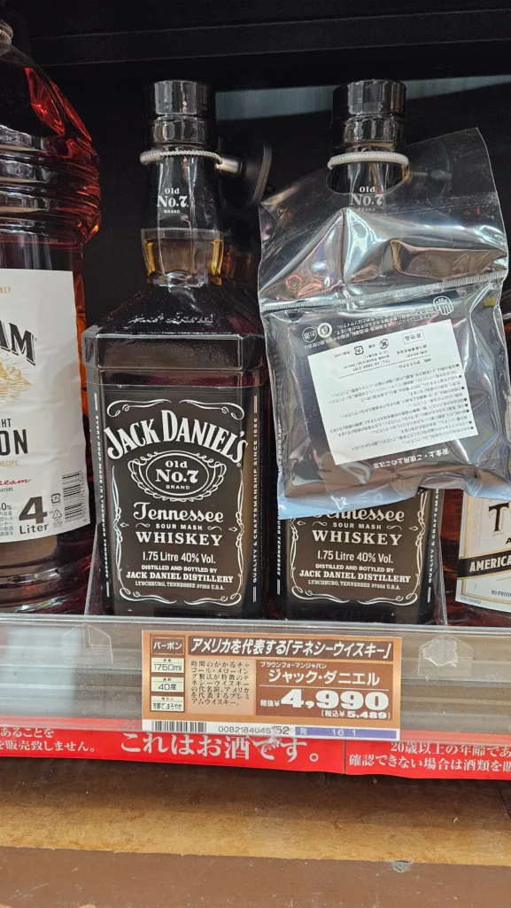 예를 들어 아래 잭다니엘은 1.75리터 용량의 병인데 4,990엔밖에 안했고