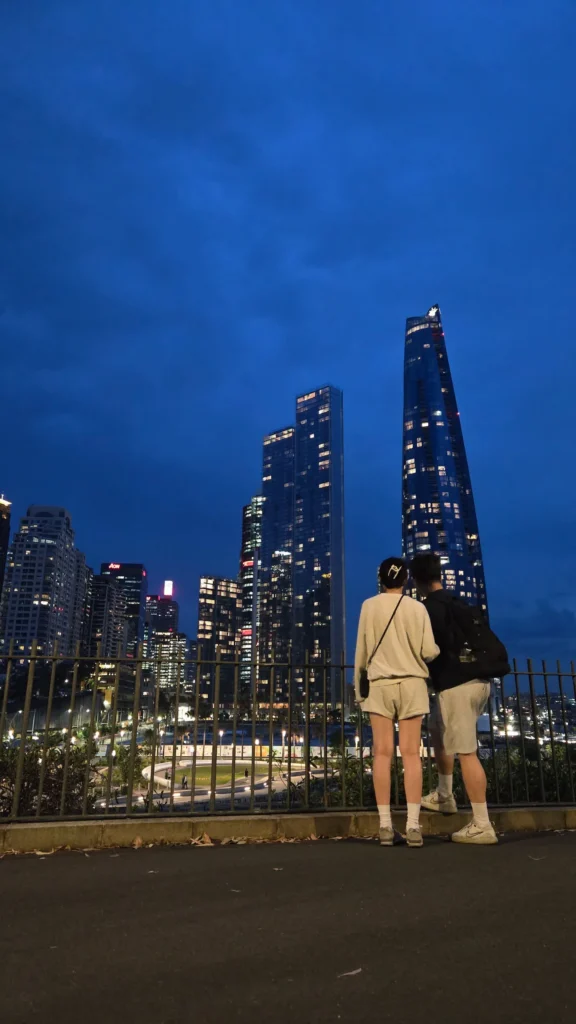 해가 떨어지고 난 뒤, 지하철을 타고 돌아가기 위해 Barangaroo역을 향해 내려오던 중 야경이 멋진 곳에서 사진을 찍었다.